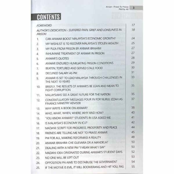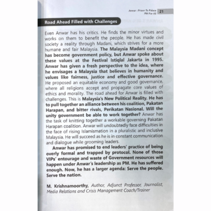 “PRISON TO PALACE, PM FOR ALL” is the story of Anwar Ibrahim’s turbulent, moving, bold, and visionary journey from a village boy to the Prime Minister of Malaysia. The chapters weave through the intricacies of political challenges, repression, injustice, and trials and tributions. Eventually, Anwar achieved his childhood dream of becoming Malaysia’s leader. The book traces his rise to power, fall from grace, and his childhood dream of becoming Malaysia’s leader. The book traces his rise to power, fall from grace, and his rise to power, fall from grace, and his resilience in the face of adversity, including ten years of inhumane treatment in prison.