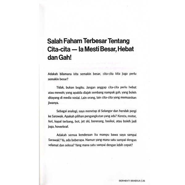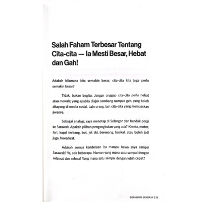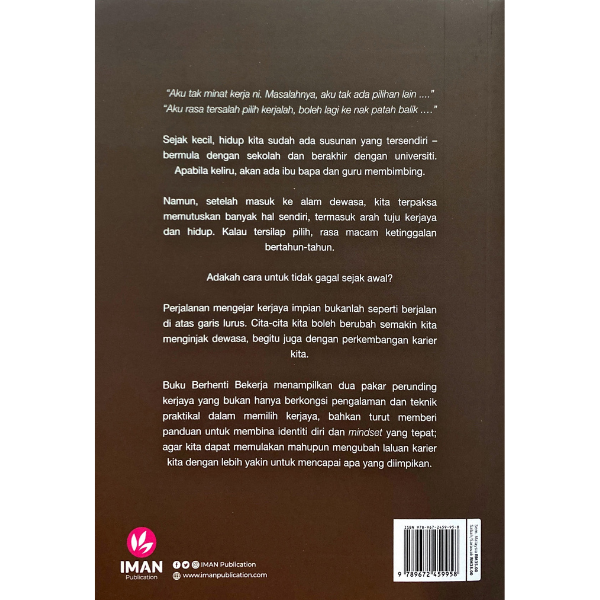 Buku Berhenti Bekerja menampilkan dua pakar perunding kerjaya yang bukan hanya berkongsi pengalaman dan teknik praktikal dalam memilih kerjaya,bahkan turut memberi panduan untuk membina identiti diri dan mindset yang tepat; agar kita dapat memulakan mahupun mengubah laluan karier kita dengan lebih yakin untuk mencapai apa yang diimpikan.