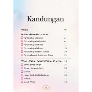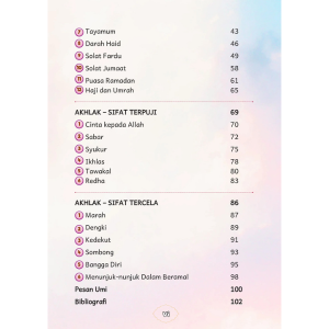Daripada mengenal Allah dan para malaikat, hinggalah kepada wuduk, solat, darah haid, serta sifat-sifat hati yang terpuji dan tercela — semuanya dihuraikan dalam gaya penceritaan yang dekat dengan dunia kanak-kanak dan sesuai untuk peringkat sekolah rendah.