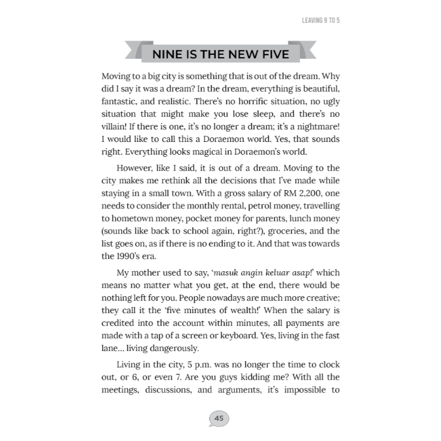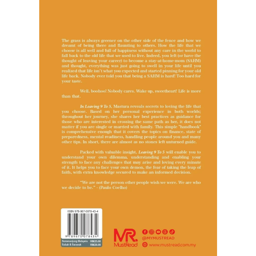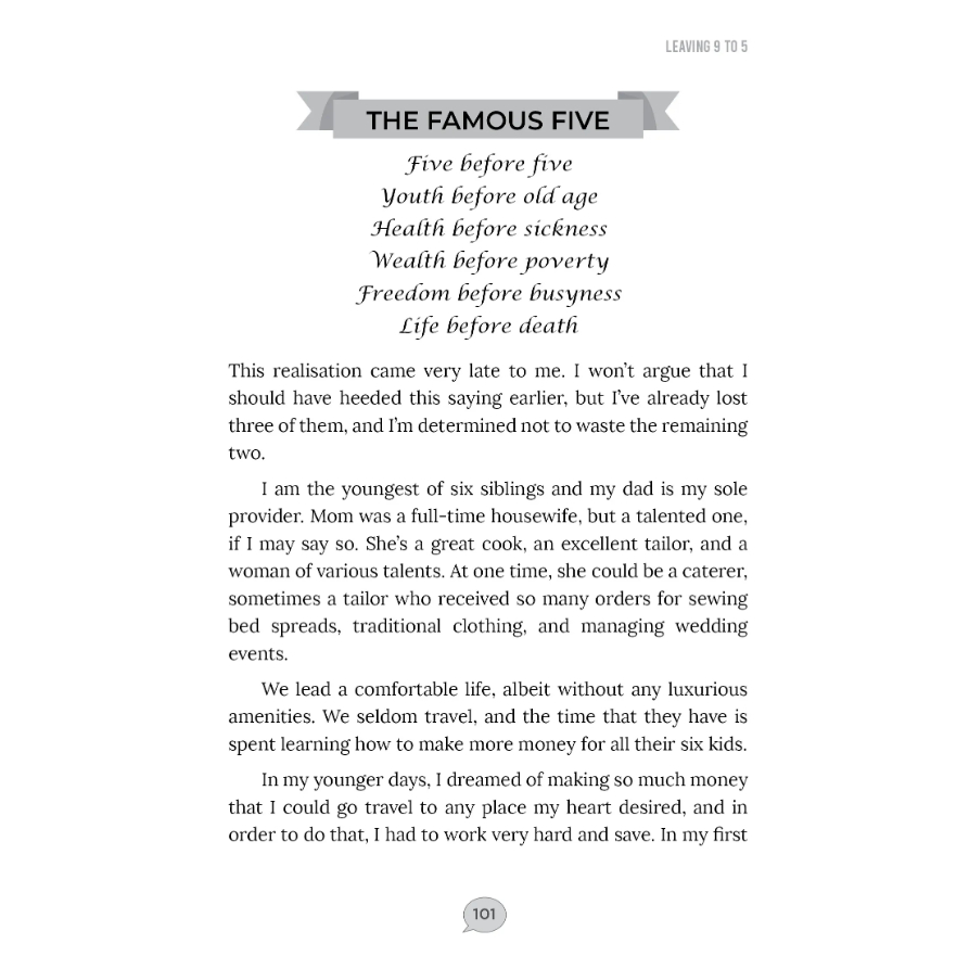 Leaving 9 To 5 will enable you to understand your own dilemma, understanding and enabling your strength to face any challenges that may arise and loving every minute of it.