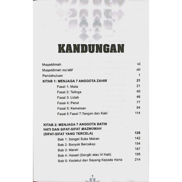 Buku ini menerangkan cara-cara untuk menyucikan hati daripada sifat-sifat mazmumah (takhalli) dan seterusnya menunjukkan jalan menghiasinya dengan sifat-sifat mahmudah (tahalli). Memiliki hati yang baik dan sejahtera bermula daripada menjaga anggota-anggota zahir iaitu mata, telinga, lidah, perut, kemaluan, tangan serta kaki dan menggunakannya pada perkara-perkara kebaikan. Seterusnya mendidik hati agar menjauhi sifat-sifat mazmumah seperti suka makan, banyak bercakap, kedekut serta sombong dan mengamalkan sifat-sifat mahmudah seperti zuhud, sabar, syukur, ikhlas, tawakkal, serta redha Setiap sifat dibincangkan dengan jelas: puncanya, kebaikan dan keburukannya, tahap atau peringkatnya, serta cara menghilangkan sifat mazmumah dan menerapkan sifat