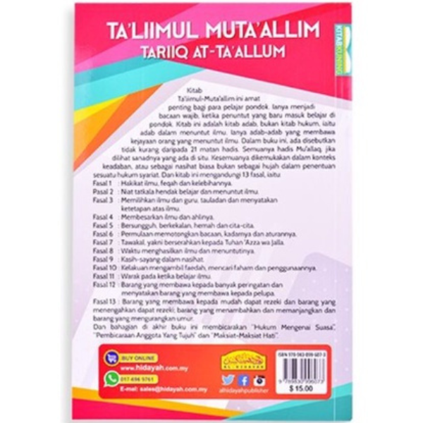 Kitab Ta’lim Al-Muta’aalllin ini amat penting bagi para pelajar pondok. lanya menjadi bacaan wajib, ketika penuntut yang baru masuk belajar di pondok. Kitab ini adalah kitab adab, bukan kitab hukum, iaitu adad dalam menuntut’ilmi. lanya adab-adab yang membawa kejayaan orang yang menuntut ‘llmu. Dalam buku ini, ada disebutkan tidak kurang daripada 21 matan hadith. Semuanya hadith mu’allaq, jika dilihat sanadnya yang ada di situ. Kesemuanya dikemukakan dalam konteks keadaban, atau sebagai nasihat biasa bukan sebagai hujah dalam penentuan sesuatu hukum syari’at. Dan buku ini mengandungi 13 fasal, iaitu: