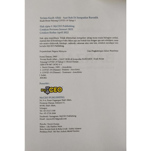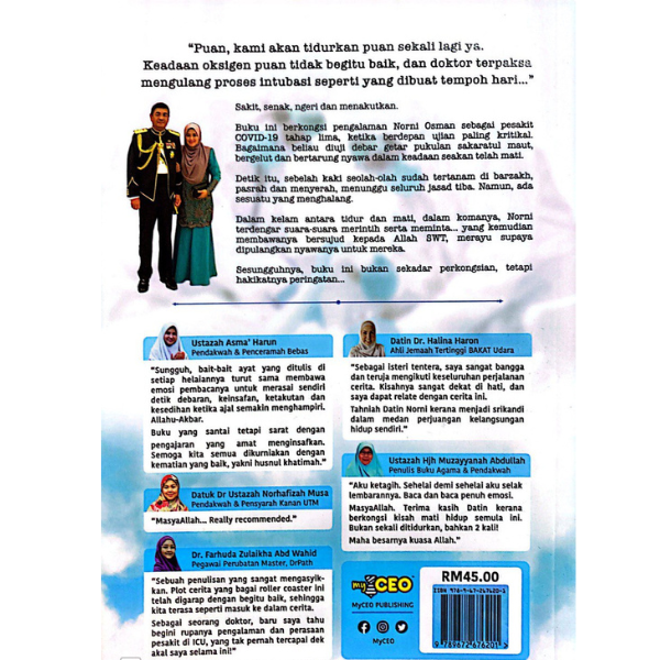 Buku ini berkongsi pengalaman Norni Osman sebagai pesakit Covid-19 tahap 5, ketika beliau berdepan ujian paling kritikal. Tatkala beliau diuji debar getaran pukulan sakaratul maut, bergelut dan bertarung nyawa dalam keadaan seakan telah mati.
